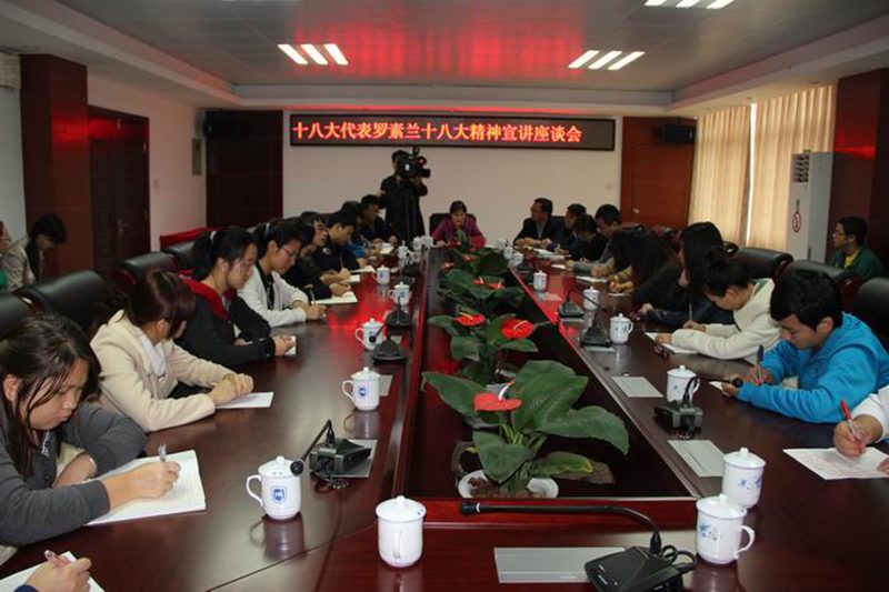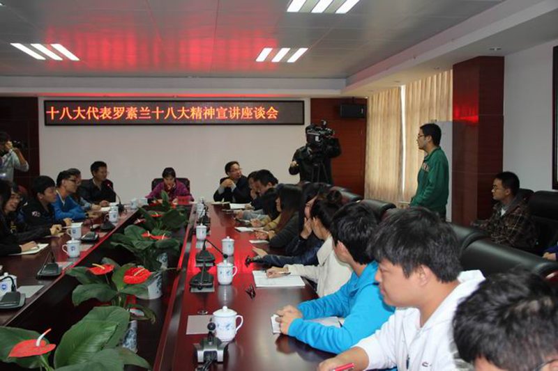 12月6日上午,为了深入学习宣传贯彻党的十八大精神,在校党委宣传部的指导下,永利官网在学校办公楼四楼会议室举行十八大精神宣讲座谈会,十八大代表罗素兰教授与永利官网师生畅谈十八大精神。校党委宣传部部长张继友、副部长谭勇,永利官网学工办主任周郭军出席座谈会。座谈会由张君成老师主持。