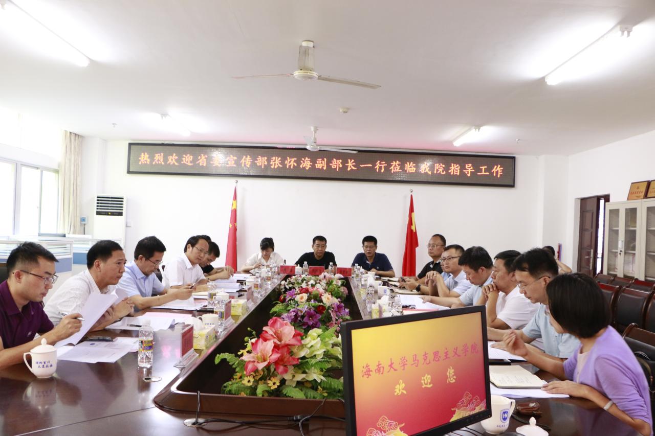 张怀海在认真听取汇报并与参会人员进行充分交流后发表讲话,对永利集团88304官网近些年的建设发展和所取得成效给予充分肯定。他指出,海南自贸港建设让海南成为全国乃至全球舆论关注的重点焦点,做好意识形态工作、舆情工作至关重要。永利集团88304官网作为海南龙头高校,要按照沈晓明书记要求,当好参与者、参谋部、孵化器和后备队,服务海南全面深化改革开放和自由贸易港建设,永利集团88304官网在海南意识形态工作中具有特殊使命和责任。他认为,海大马院正处于快速发展时期,在全国高校马院中显示度和影响力明显提升,学院制定的“十四五”规划具有较强的可操作性,希望海大马院在海南自贸港建设背景下,提高政治站位,对标全国、放眼全球,高标准、高要求推进相关建设发展工作。他表示,省委宣传部将按照中央和省委相关文件精神,进一步关心和支持海大马院建设发展,推进落实部校共建永利集团88304官网相关工作,扎实推动马院内涵式发展,切实提高人才培养质量。