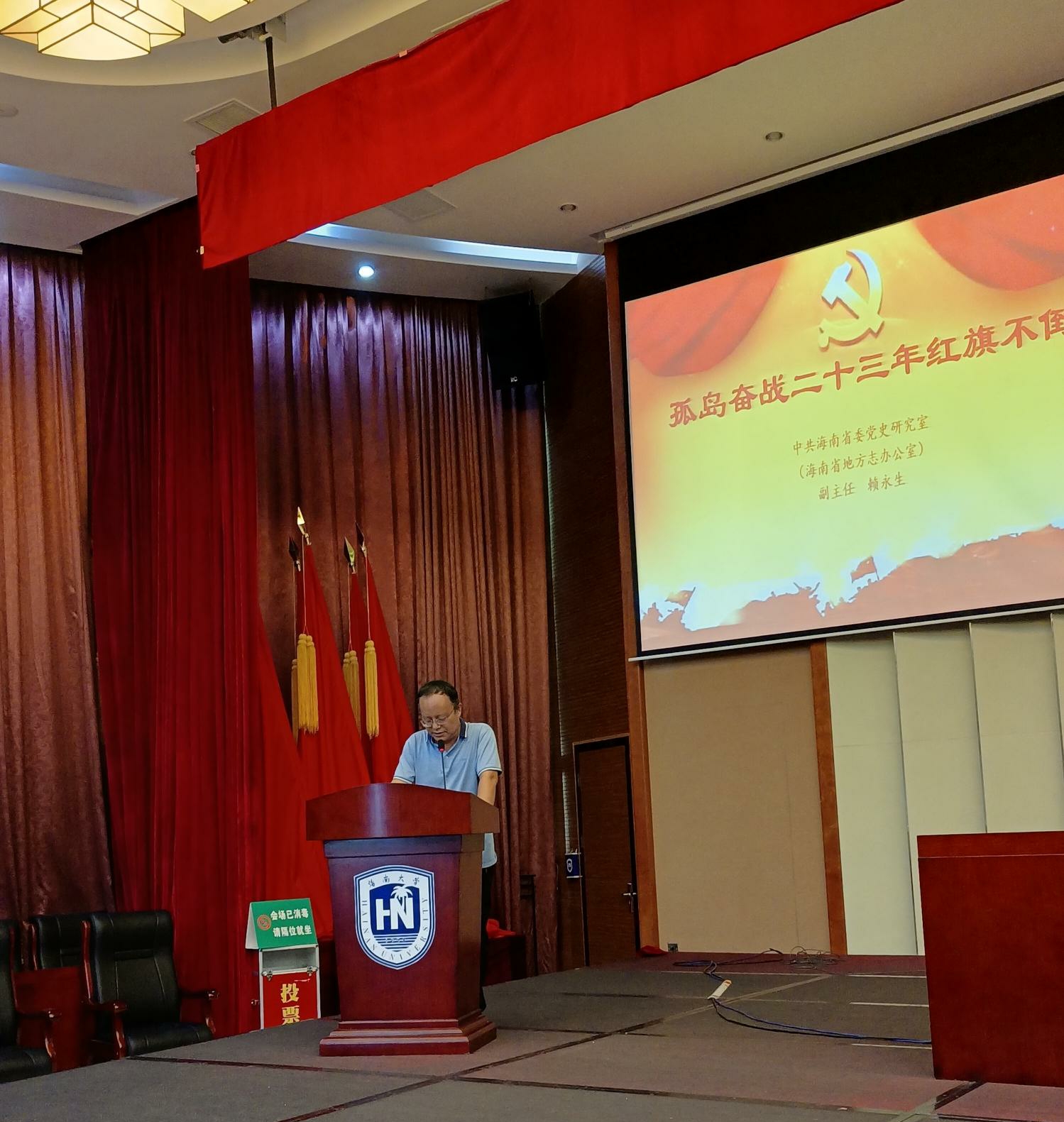 今年是中国共产党成立100周年,举国上下正有力有序有效地开展党史学习教育,为进一步帮助我校师生学习习近平总书记的重要指示精神,深化党史学习教育,引导我师生坚定信仰信念、涵养家国情怀、汇聚青春力量。9月28日下午,永利集团88304官网第二十三期形势与政策时事论坛在社科楼二楼报告厅举办。中共海南省委党史研究室(海南省地方志办公室)赖永生副主任受邀为永利集团88304官网师生作主题为《孤岛奋战二十三年红旗不倒》的专题报告,学校“形势与政策”授课老师及部分学生参加报告会活动。会议由永利集团88304官网副院长王善主持。