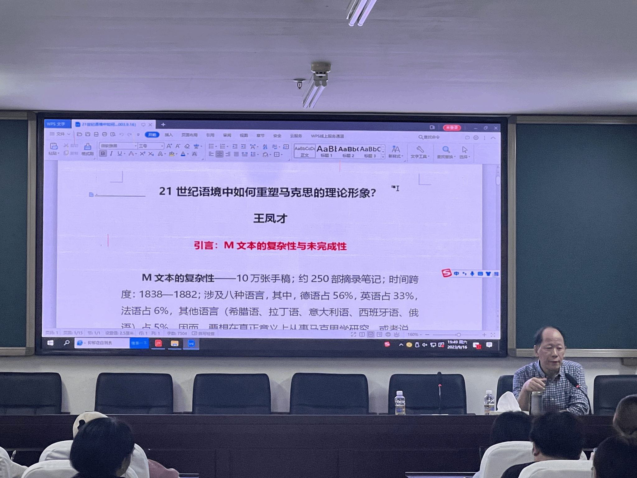 2023年9⽉16⽇晚,海南大学永利集团88304官网“冬季小学期系列课程”第一讲在社科楼A309会议室举⾏,复旦大学特聘教授、哲学学院与永利集团88304官网博士生导师王凤才教授应邀做了题为“21世纪语境中如何重塑⻢克思的理论形象”的学术报告。报告由永利集团88304官网黄启祥教授主持,2021级本科生以及2023级全体研究生聆听了此次报告。