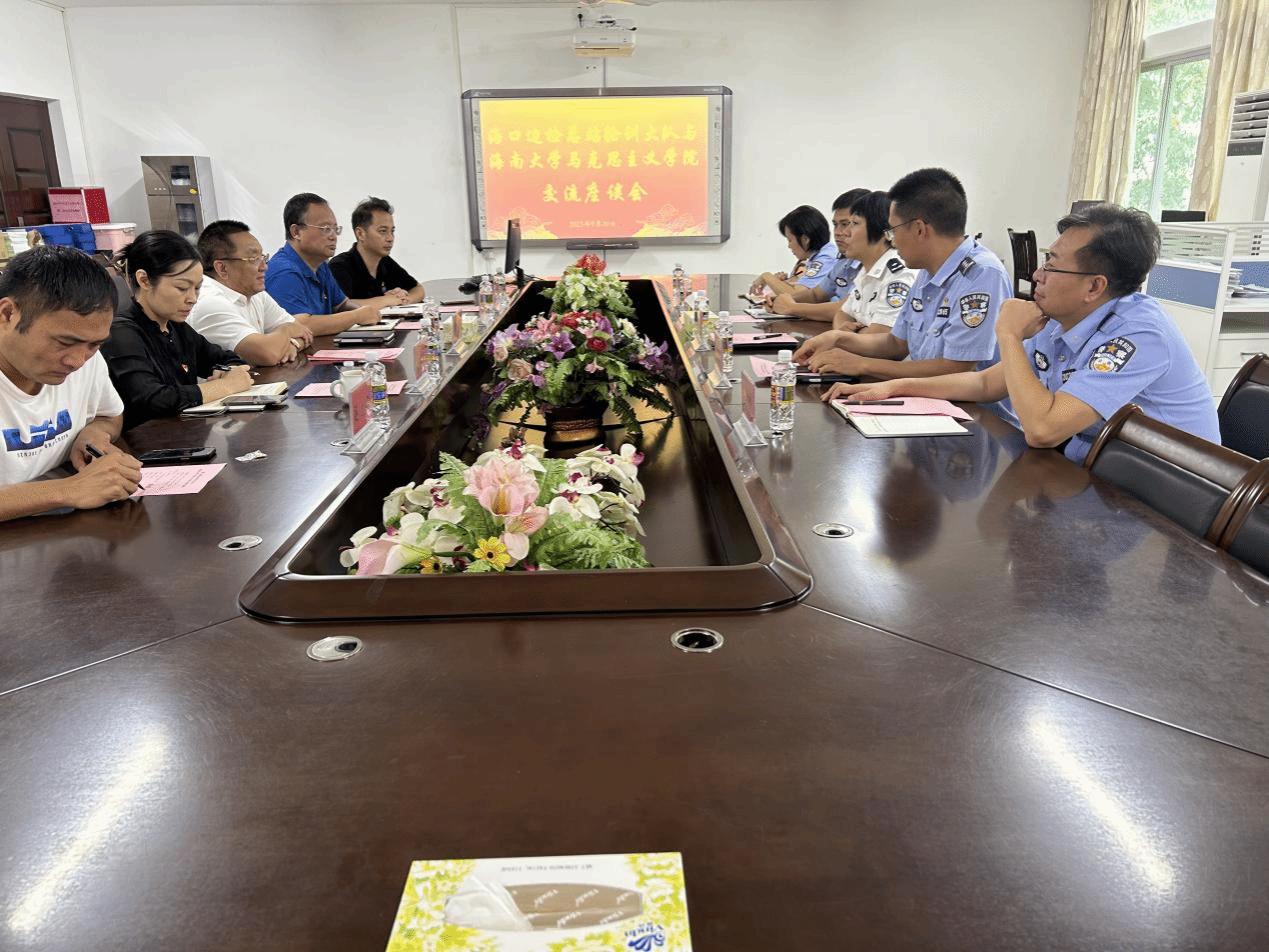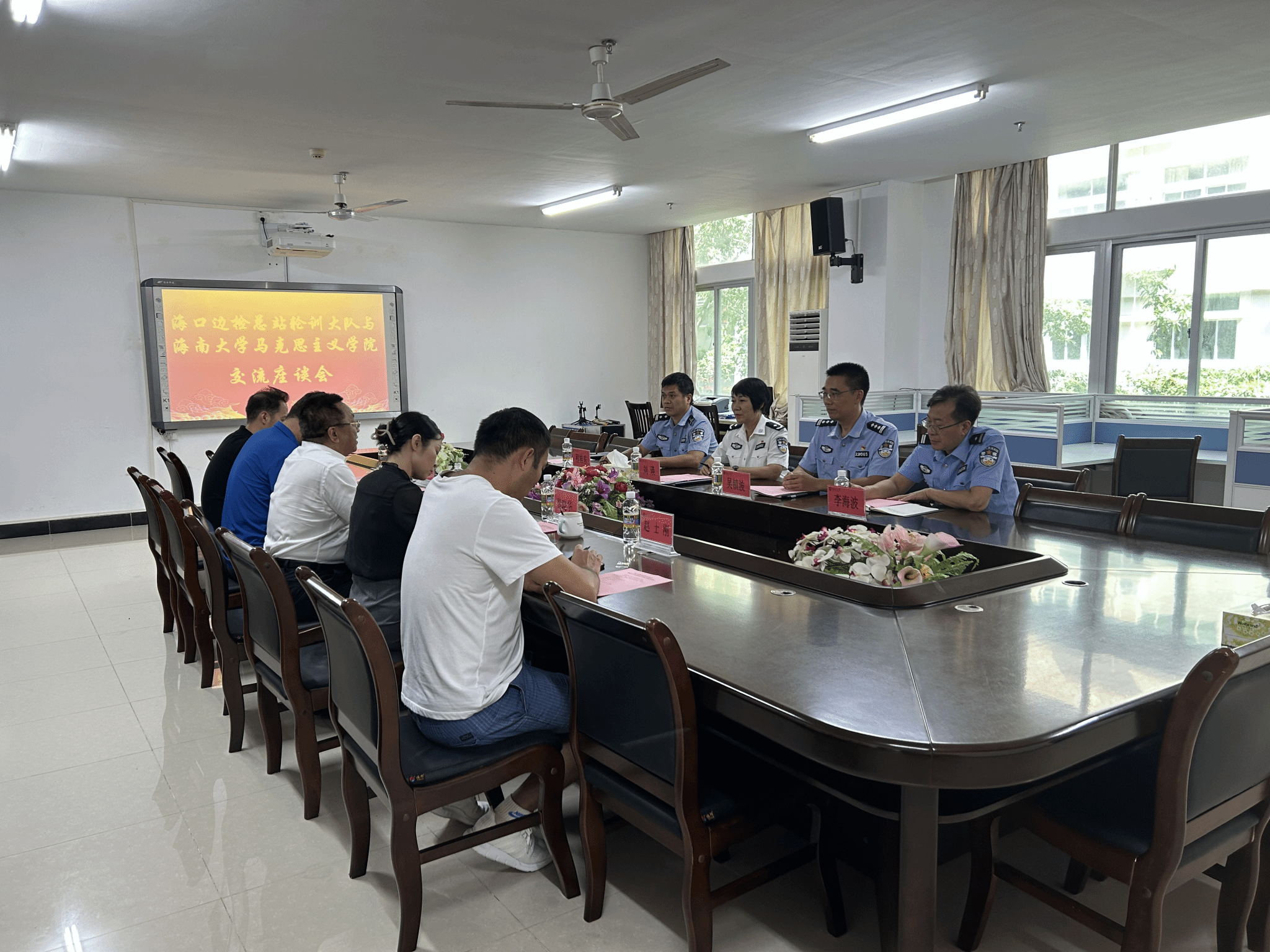 2023年9月20日海口边检总站轮训大队与永利集团88304官网在社科楼A311会议举行交流座谈会,海口边检总站轮训大队大队长刘瑛、副大队长吴镇波、处长程桂东、教员李海波和陈蕾出席座谈会,永利集团88304官网部分领导班子成员和科室主任参加会议,会议由学院党委书记段捷频主持。