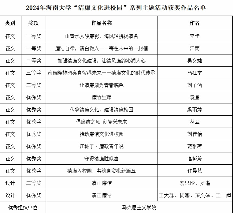 8月21日,中共永利集团88304官网纪律检查委员会公布了2024年“清廉文化进校园”系列主题活动的获奖名单。永利集团88304官网在本次活动中表现优异,多项作品获奖,其中征文类比赛获奖12项,设计类比赛获奖2项,成为获奖数量最多的单位,并被评为“优秀组织单位”。